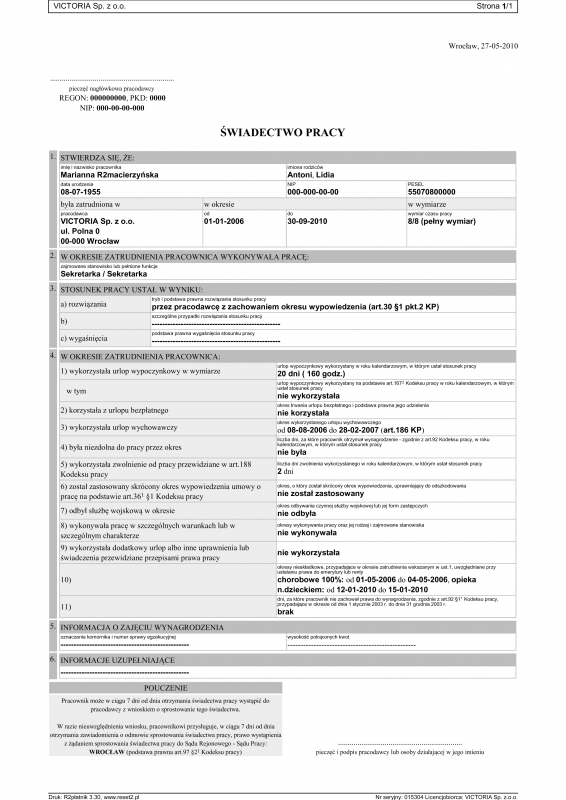 - estetyczny druk świadectwa pracy uwzględniający wszystkie opcje